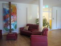 Die Glaskunst „Leben und Sterben“ gibt dem Raum eine ganz besondere Ausstrahlung. Der Künstler Thomas Backhaus hat viel Symbolik in diesem Bild untergebracht: Das Farbspiel der Glasscheiben, die lebensgroße Acht, die den immerwährenden Lebensstrom symbolisiert, der rostige Stahlträger, der dieses wunderbare Glasbild brutal unterbricht- alles erzählt vom Leben, Sterben und Trost.