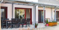 An die Wohnküche schließt sich eine große Terrasse an, weite Türen lassen Licht und Luft ins Haus.
