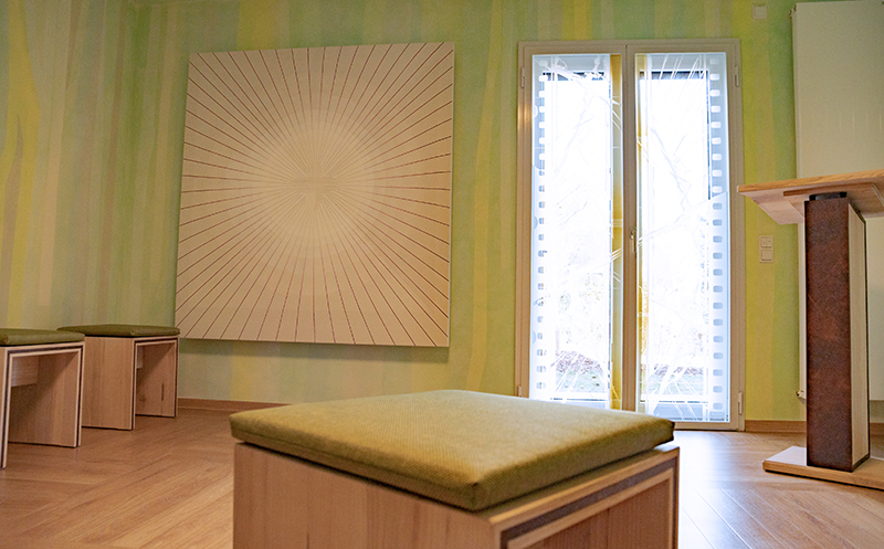 Für gemeinsame Andachten und persönliche Ruhemomente gibt es den außergewöhnlich gestalteten „Raum der Stille“. Wie ein schützendes Blätterdach in einem sonnendurchfluteten Wald empfängt dieser Raum seine Besucher. Der Künstler Helge Warme hat den Raum als Gesamtkunstwerk gestaltet- von der Wandgestaltung, über das Holzrelief an der Stirnseite, die Glaskunst vor der Terrassentür und die Einrichtungsgegenstände. Bewusst karg, puristisch gestaltet, findet das Auge wenig Ablenkung und der Mensch Ruhe.